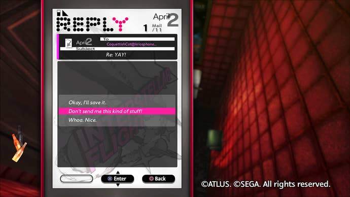 The story's choice-based progression evolves in the same way as the original: in the decisions you make while hanging out at the Stray Sheep bar. There you talk to its customers and learn about their own issues, catch up with your friends, drink, play the in-game puzzle arcade cabinet Rapunzel, and even talk to Rin, who Erica and the Boss of the bar have taken in as an employee. Vincent texts Katherine, Catherine, and Rin during these segments, swapping photos and choosing text messages very carefully. The Stray Sheep has a nifty jukebox too, where you can play a number of tracks from Catherine, Persona 5, Persona 4, and more's respective soundtracks. (You bet your ass I had Persona 3's "Burn My Dread" playing on loop.)