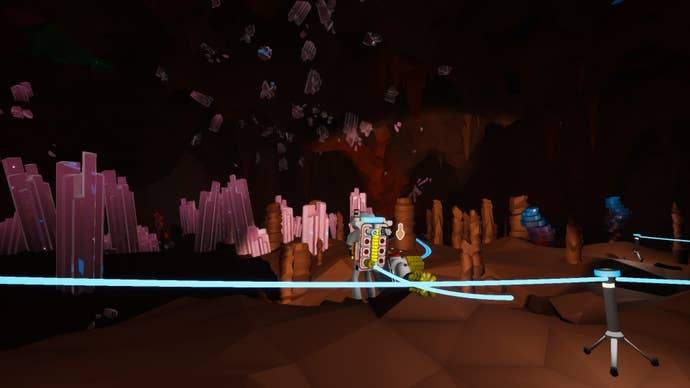 As you expand your reach across a planet, or even into its very core, the tethers let you know where you've been and the edges of your current exploration. Together with beacons, another craftable item, you'll eventually build a network of tethers and stations throughout your current planet. Even when the darkness of the underground begins to crowd around me, I can look at my web of light as a connection to everything else I've established so far. It adds a sense of safety in treacherous situations.