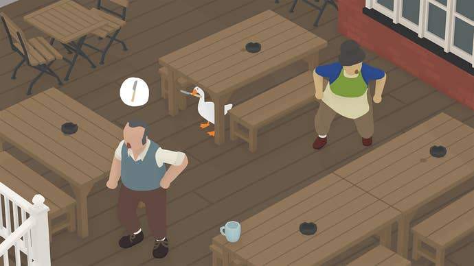 Untitled Goose Game slaps you down as a goose with attitude. You honk, flap your wings, and pick up whatever's grabbable with your beak. Your goal? To annoy people, as geese tend to do. (One out of every three people has a goose terror story. This is a scientific conclusion I've come to with my own experiences.) It's maybe the purest game I've played in some time.