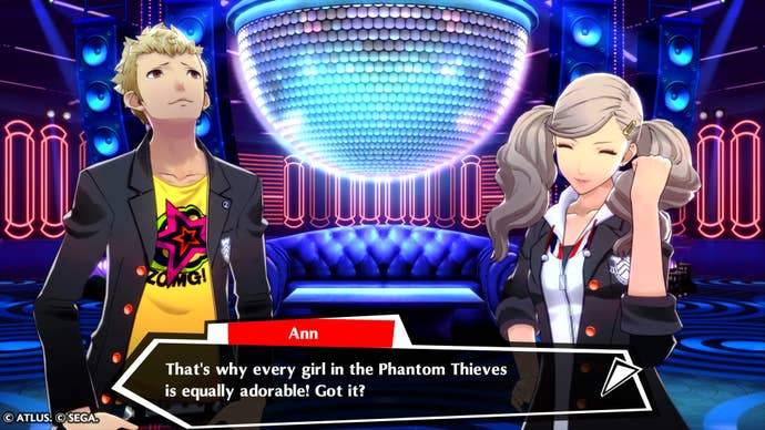 In lieu of Persona 4: Dancing All Night's sorta-sequel visual novel that acted as its story mode, Persona 3: Dancing in Moonlight and Persona 5: Dancing in Starlight instead get pared down social elements in its place. The visual novel-y parts instead feel like Social Links or Confidants from the games they're based from: bite-sized social interactions with your pals, except it's only the non-consequential moments from them. You get scenes like Ken from Persona 3 missing the notably absent Koromaru, or Futaba from Persona 5 gushing about her favorite idols, but nothing quite matches the mystery that was at the center of Dancing All Night's story. It lacks even the heartwarming moments of what Dancing All Night had, such as Nanako dancing to the Junes theme. What we get in its place is Ryuji from Persona 5 knowing how to whip and nae nae.