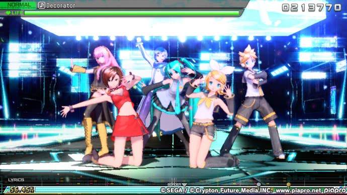 The Project Diva games are led by the all-stars of the Vocaloid world: Hatsune Miku, Megurine Luka, Kagamine Rin and Len, Meiko, and Kaito. Vocaloids, for the uninitiated, are basically digital instruments that producers sculpt into de facto pop stars. Fans of the humanized software across the world write lyrics and compose songs for Miku and other Vocaloids, and share their music. The Project Diva series from Sega, basically, gives the music an even bigger platform beyond the niche fandom. We're reminded of it constantly too—every song starts with credits to who wrote and produced the song, and every screenshot snapped in-game is slapped with a giant copyright in the bottom corner—as if to constantly remind me of how much individual licensing it takes just to make this rhythm game possible.