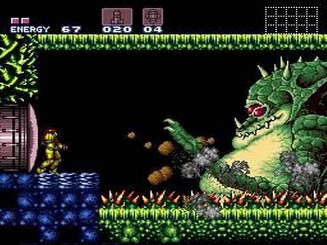 Super Metroid revels in subverting the player's assumptions like this, in putting unexpected spin on what had come before. Plummet through one of the false floors that littered the original NES game's labyrinths and you once again have to deal with the chore of working your way back up to the critical path... but this time, friendly local critters will offer handy diegetic tips to unlock Samus's hidden skills, such as wall-jumping and rocket jumps. You'll encounter a fake version of Mother Brain enforcer Kraid, as in the first game... but this time, the real Kraid turns out to be a towering monstrosity too enormous to fit onto a single screen. You catch a shocking, unnerving glimpse of a metroid while traveling through a conduit in underwater zone Maridia, long before the showdown with Mother Brain... but it turns out to be a failed clone of the space parasite. And once you do encounter metroids (precisely where veterans of the original game would expect to come across them), you don't expect the terrifying new twist that gives the game its title: The eponymous super metroid, a creature altogether different from the lifecycle variants of Metroid II.