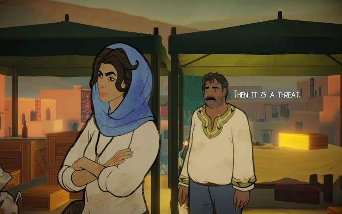 Sailing, in general, soured my time with Heaven's Vault—and you sail quite a bit. Conversations that would happen while heading somewhere would distract me from making correct turns, as the only voice acting is the occasional narrative voiceover of Aliya when entering a new locale. If I was in the midst of talking to my robot and came across an abandoned ruin on the side of the river, there was no way for me to cancel my conversation and see if it had any artifacts; in these circumstances, the end of my locked-in conversation would usually be bookended with "You missed a ruin," as if I hadn't hard turned into the side of the river to slow my pace, hoping for the conversation to end so I could approach the floating rock.