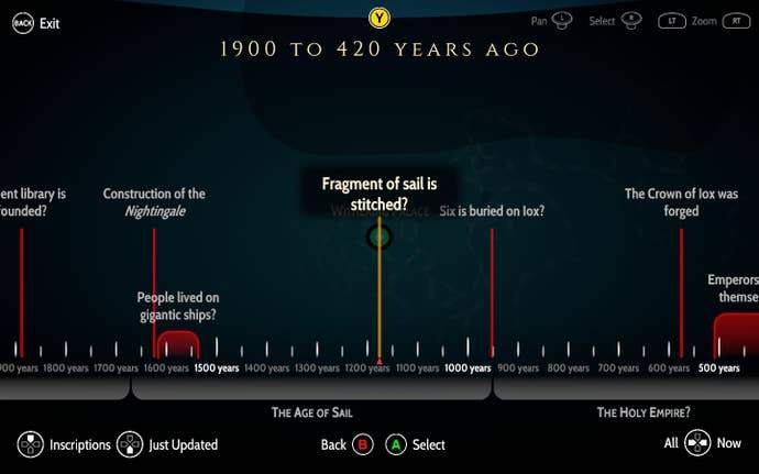 It soon turns daunting though, whether it's your first or third playthrough. With each new fact learned—whether from an artifact you discover, an etching of the Ancient language (merely called "Ancient") you find, or a conversation with an NPC—the vast timeline of the world grows, dating back anywhere from mere minutes to thousands of years ago. It's intimidating to sift through, and makes Aliya feel astoundingly small in the grand scope of this fascinating world we're traveling through with her.